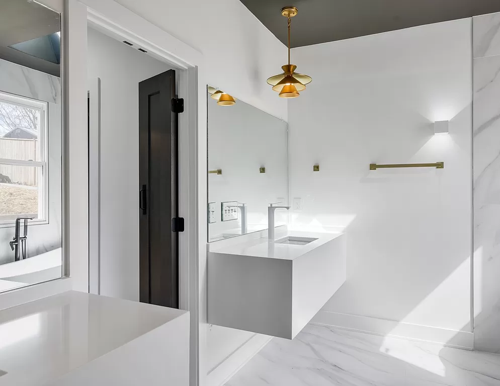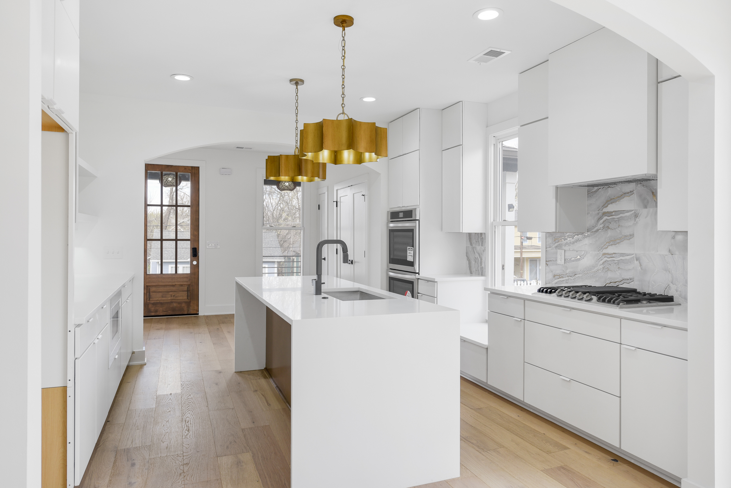 Embarking on this historic renovation project was an absolute joy! It was imperative for me to preserve the home’s  charm. Collaborating closely with the architect, we designed archways that usher you into a bold white kitchen, and we installed a majestic floor-to-ceiling fireplace that anchors the front sitting room. The selection of exposed faucets was a nod to timeless elegance. My vision was to weave in elements of surprise and sophistication throughout the home, from the sleek glass rails to the captivating light fixtures, all while honoring the deep historical essence of the space.